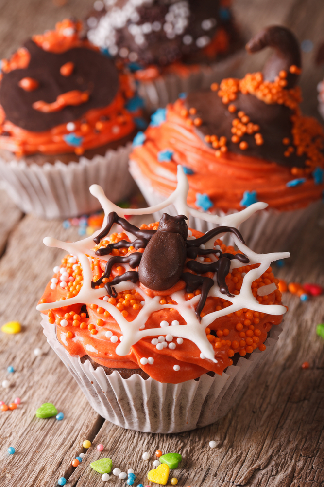 Sciogli il cioccolato a bagnomaria e mettilo in una tasca da pasticcere. Disegna con il cioccolato delle ragnatele sulla glassa dei muffin, aspetta che si solidifichi e servi.
