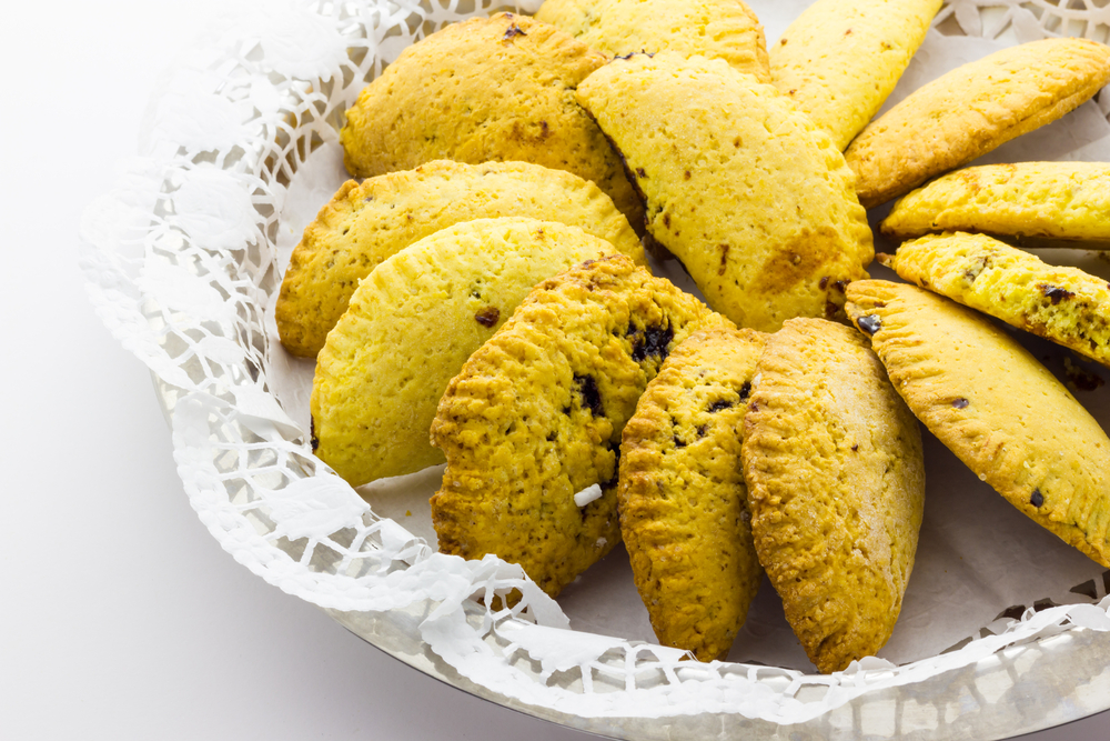Fate la fontana e amalgamate tutti gli ingredienti. Una volta ottenuto un impasto morbido stendete con il mattarello una sfoglia non troppo sottile. Mettere un cucchiaino di ricotta insaporita con zucchero, cacao e archermes, quindi tagliate come ravioli. I ravioli possono essere fritti o cotti al forno. Una volta freddi, spolverateli con zucchero a velo.